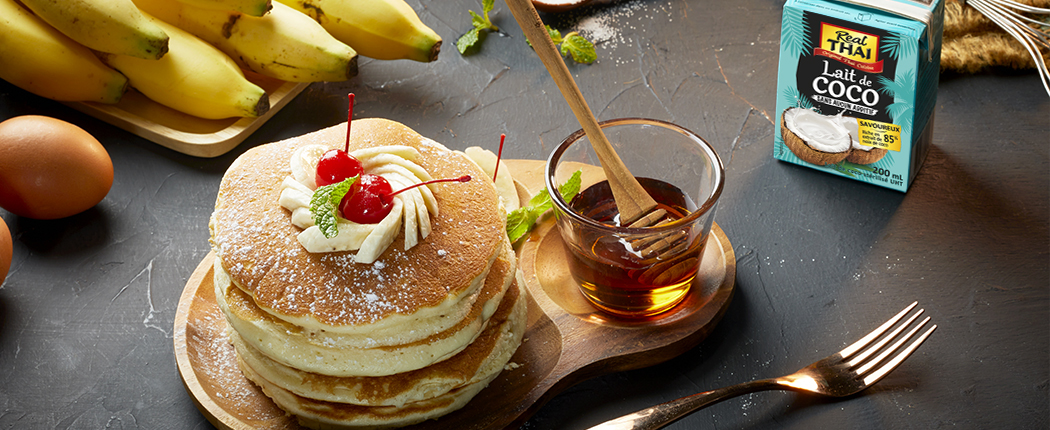 8. Servez les pancakes tièdes ou froids avec des fruits, de la noix de coco râpée ou avec ce qui vous voulez.