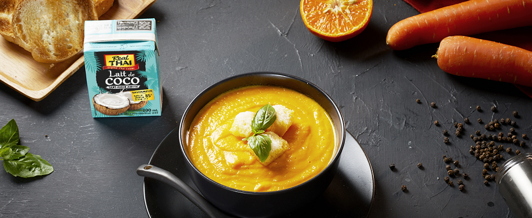 4. Mixez la soupe avec le lait de coco Real Thaï et la coriandre.
