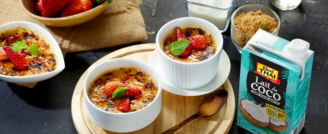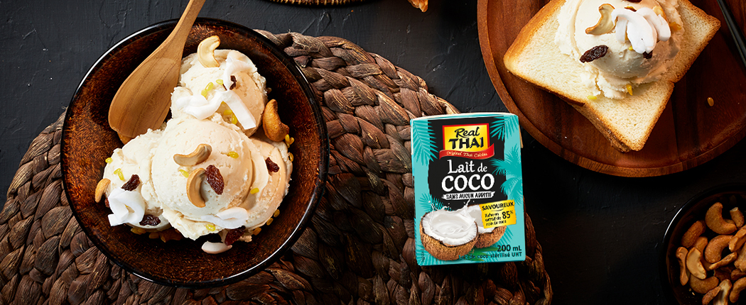 2. Mélangez le lait de coco Real Thaï et la crème liquide dans une casserole. Ajoutez les graines de vanille et le sucre. Mélangez et portez à ébullition. Retirez la casserole du feu, et laissez infuser quelques minutes.