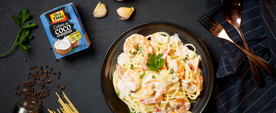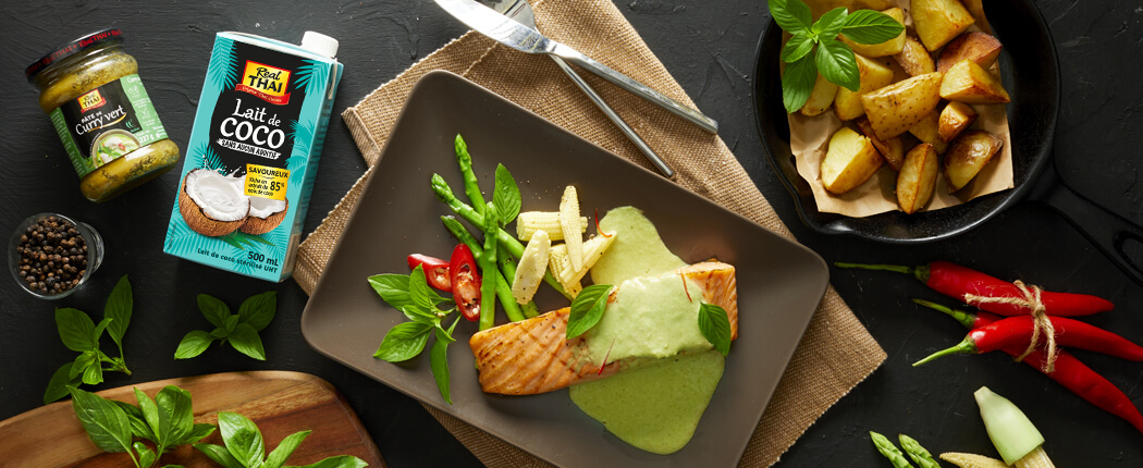 1. Chauffez une cuillère à soupe d’huile dans une casserole. Ajoutez 1 cuillère à café de pâte de curry vert Real Thaï, laissez cuire quelques minutes. Verser 200ml de lait de coco, mélanger et porter à ébullition.