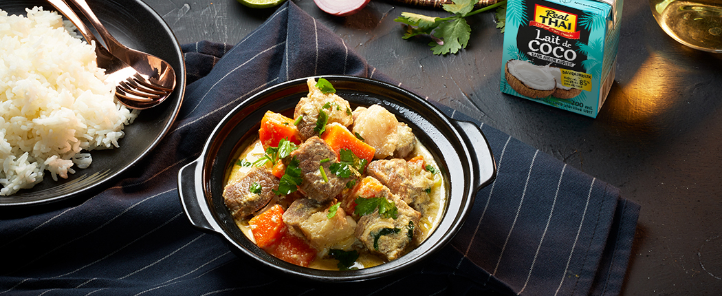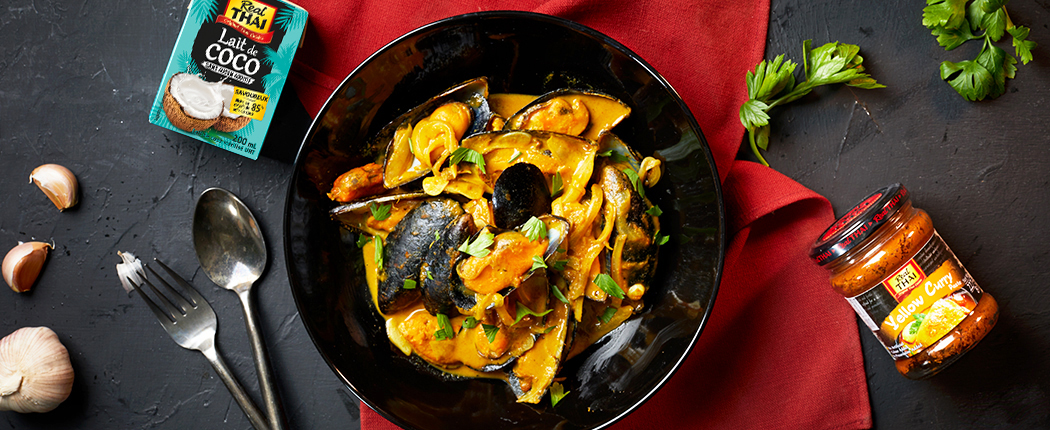 3. Mélangez 200 ml de lait de coco Real THAI et 1 cuillère à café de curry dans un bol.